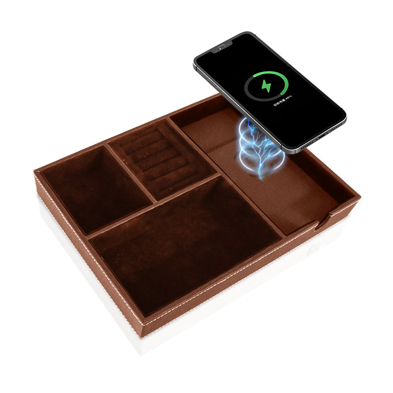 SANZIE Leather Tray with Wireless Charger - Nightstand Organizer for Phone, Wallet, Keys, Sunglasses, Watches, Jewelry, and More