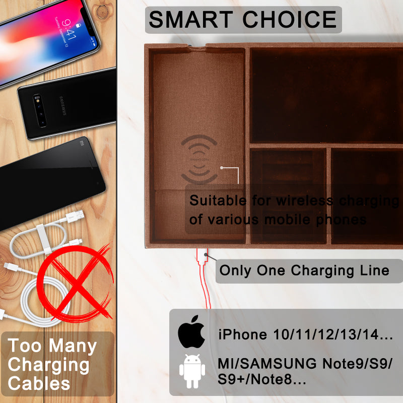 【Wireless Charging】The tray has a built-in wireless charger under the mobile phone storage area. Simply place your compatible phone on the tray and it will begin charging automatically. This feature is compatible with iPhone 8/X/11/12/13/14/15/SE/Pro/Pro Max. Please note that the charger and USB-C cable are not included.