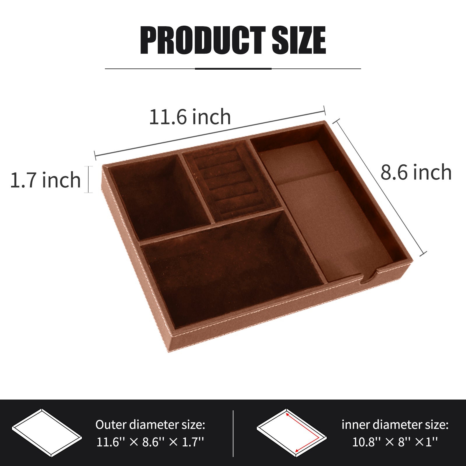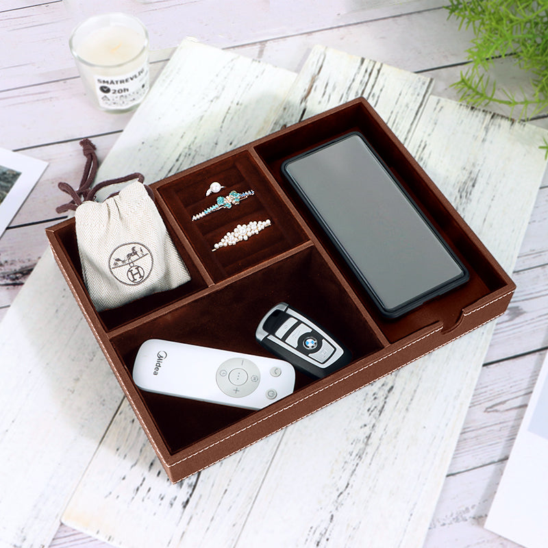 Easily organize and keep everything in one place on your dresser or nightstand, perfect for storing smartphone, wallet, keys, sunglasses, watches, jewelry, cash, coins, pens and ect.